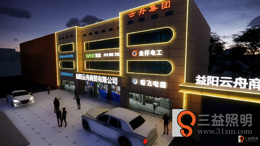 益陽市云舟商貿(mào)公司外墻燈光設(shè)計(jì),設(shè)計(jì)采用LED無縫線條燈,不銹鋼發(fā)光字。