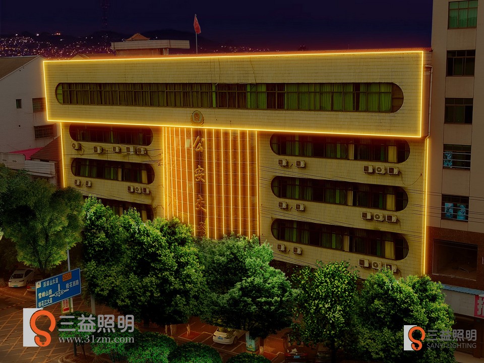桃江縣公安交警大隊(duì)、事故入處理中心外墻燈光設(shè)計(jì)方案,采用線條燈勾勒大樓輪廓。